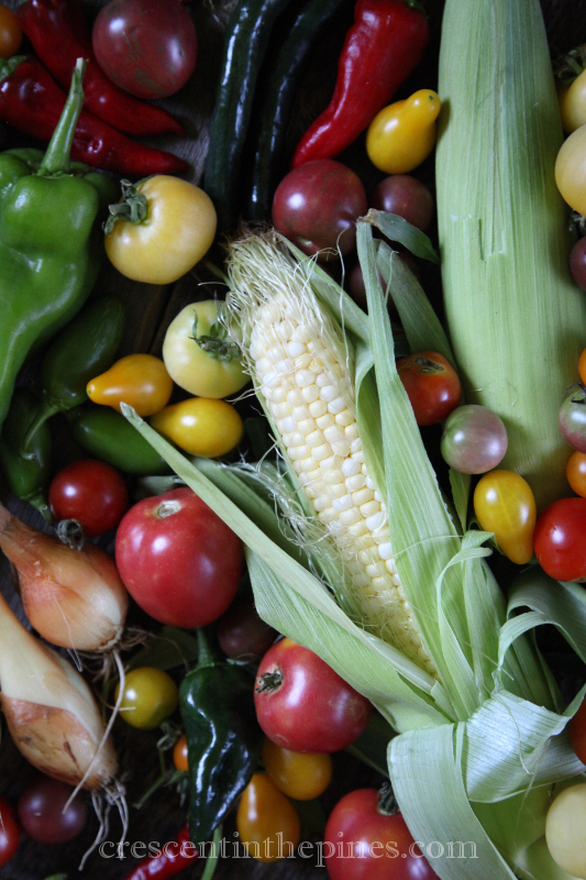 Cornbread lends itself ideally to mashups with new ingredients, both holding its own flavor yet being mild enough by nature to allow additional ingredients a platform from which to shine. In this case, vegetables are the feature, with the fresh corn amplifying the bread’s flavor and the other veggies playing off same. I used what I had an abundance of but do play with this platform, adding and subtracting with whatever vegetables you have available. Fresh from the oven with a bit of butter, this bread is perfect to enjoy on the front porch while summer rain comes down.