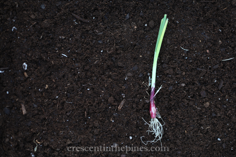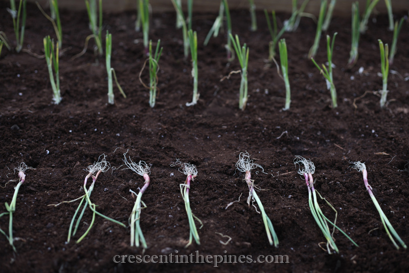 To plant, shove your finger into the dirt about an inch and place the onion in then gently firm the dirt around it, just enough to fill the hole and stabilize the onion. This part is remarkably fun for your little garden helpers. Water lightly after planting and continue to do so daily for a few days until the sets start to show green tops or the plants green tops grow noticeably. After that, taper off watering to every other day depending on heat and rainfall in your area. Onions will not tolerate constant dampness.