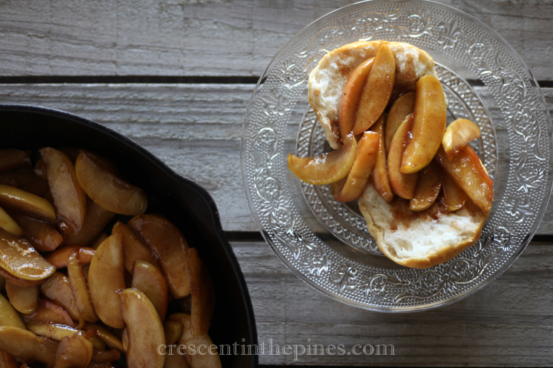 The brown sugar coating and juice from the apples heats into a glaze, while the cinnamon and spices lend a warm comforting flavor, beautifully matched with a hot cup of coffee. A little like apple pie filling for breakfast, these fried up beauties are a perfect topping for fluffy homemade biscuits and butter.