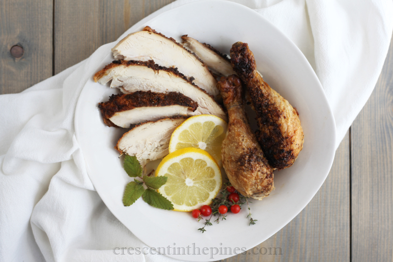 Loosen the skin of the chicken, and rub the butter mixture underneath the skin, over the breast and legs. Brush the outside of the skin with olive oil and sprinkle salt and pepper. Place the reserved balm and one garlic head cut in half into the cavity of the chicken, tie the feet. Cut remaining garlic heads and lemons in half and lay in bottom of slow cooker. Cut the bottoms off the lemons so they lay flat. Rest chicken on top of garlic and lemon halves. Cover top of chicken with additional lemon slices. Cook on high for 3 hours then reduce heat to low and cook until chicken is very tender and an instant-read meat thermometer inserted into the thickest part of a thigh, not touching bone, reads at least 160 degrees, 2 to 3 more hours. Optionally, the chicken may cook on low setting 6 to 8 hours. Slow cooker cooking times vary, so be sure to use a meat thermometer to check for doneness. Remove chicken and place in a 9×13 glass or ceramic baking dish. Place baking dish in the oven under the broiler for about 4-5 minutes, just until the skin darkens to a beautiful rich brown. Allow chicken to rest after removing it from the broiler for 5-10 minutes. Carve and serve.