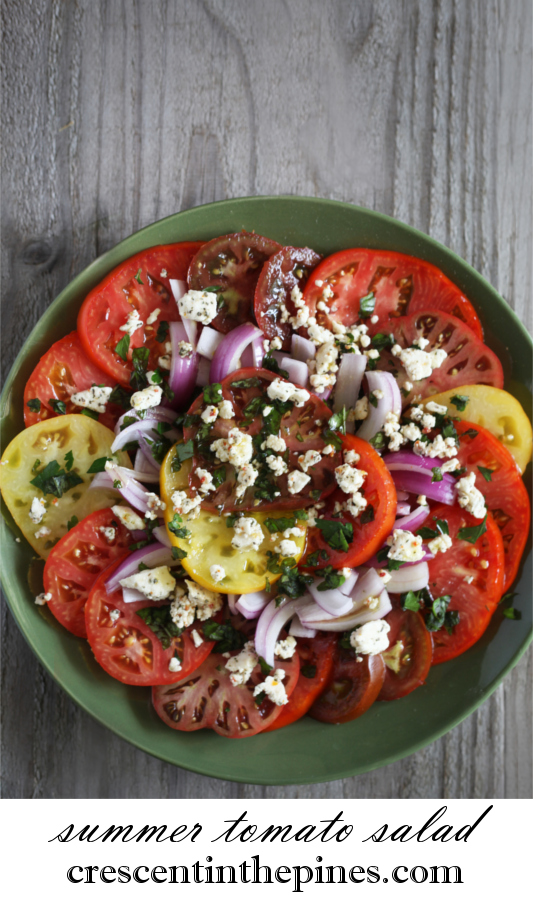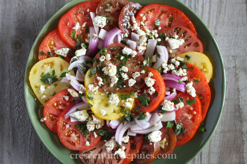 July has arrived all heat and humidity, blinding bright sunshine, and the urge to do little more than lay by the waterside. While I tend to wilt in the heat, the cucumbers and okra are putting on and my peppers and tomatoes are in heaven, producing in abundance. Inspired by the bumper crop of tomatoes this year I decided to share a simple recipe for tomato salad, a personal favorite and perfect treat on a hot day or a beautiful (yet easy) side for your next gathering.