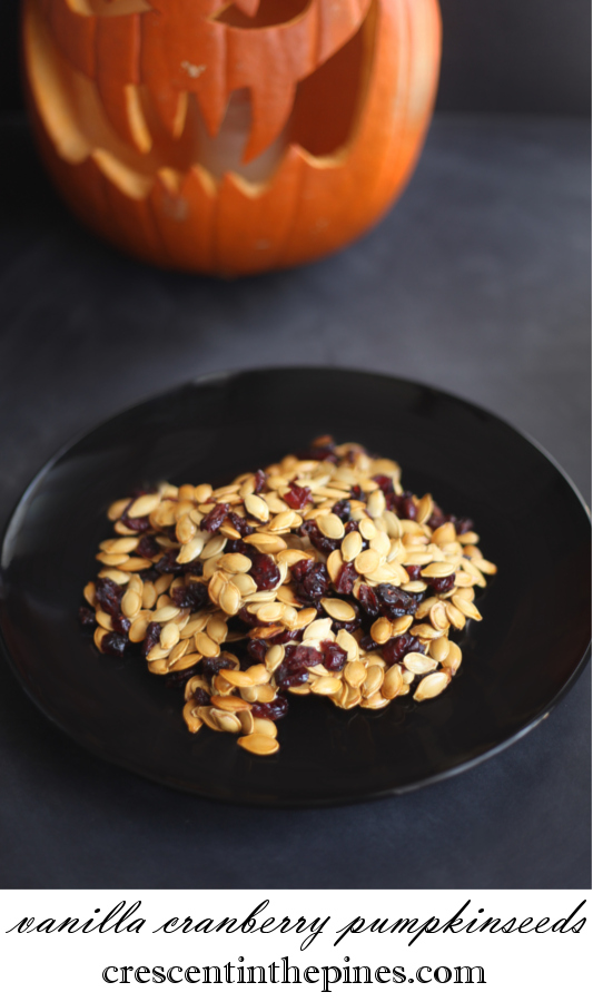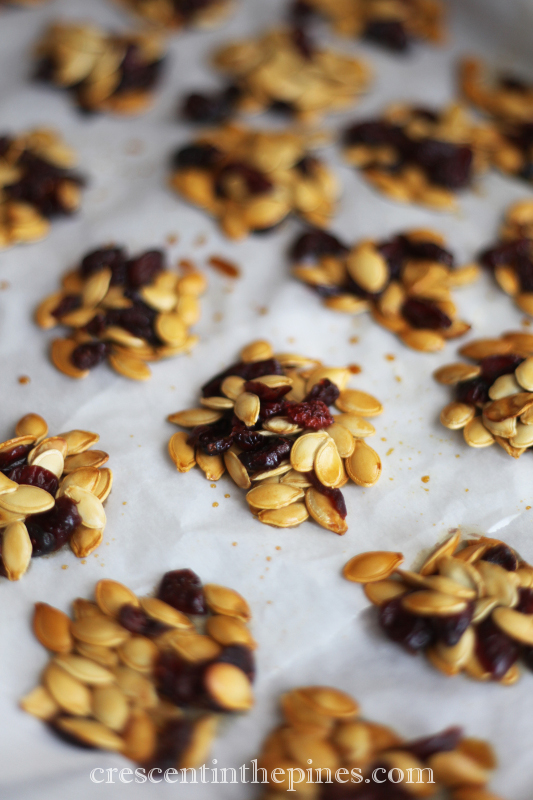 And so, as we prepare costumes and travel plans and watch E run amuck in her amazing unicorn costume, a new recipe for those tired of the old standard roasted pumpkin seeds. With multiple pumpkins carved into Jack O’ Lanterns or roasted into homemade pumpkin pie, standard roasted seeds would’ve been running out of our ears. But this recipe, adapted from Wallflower Girl, plays the wholesomeness of roasted pumpkin seeds against the sweetness of honey and the tartness of dried cranberries. A delicious snack, it’s perfect for an overabundance of pumpkinseed.