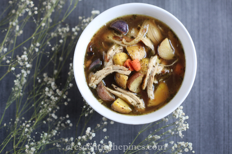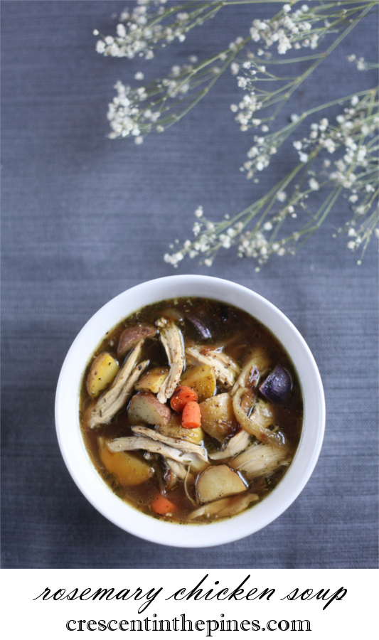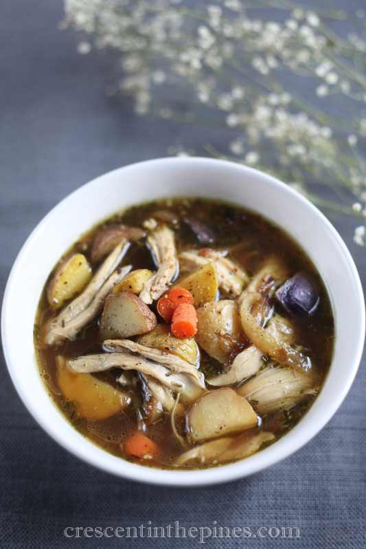 ROSEMARY CHICKEN SOUP WITH ROASTED ROOT VEGETABLES & CARAMELIZED ONION